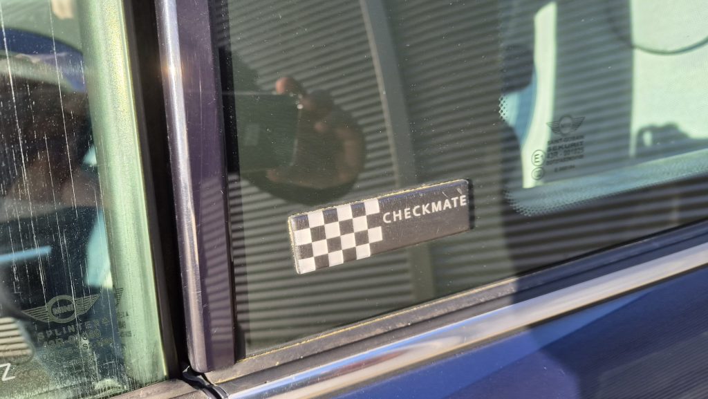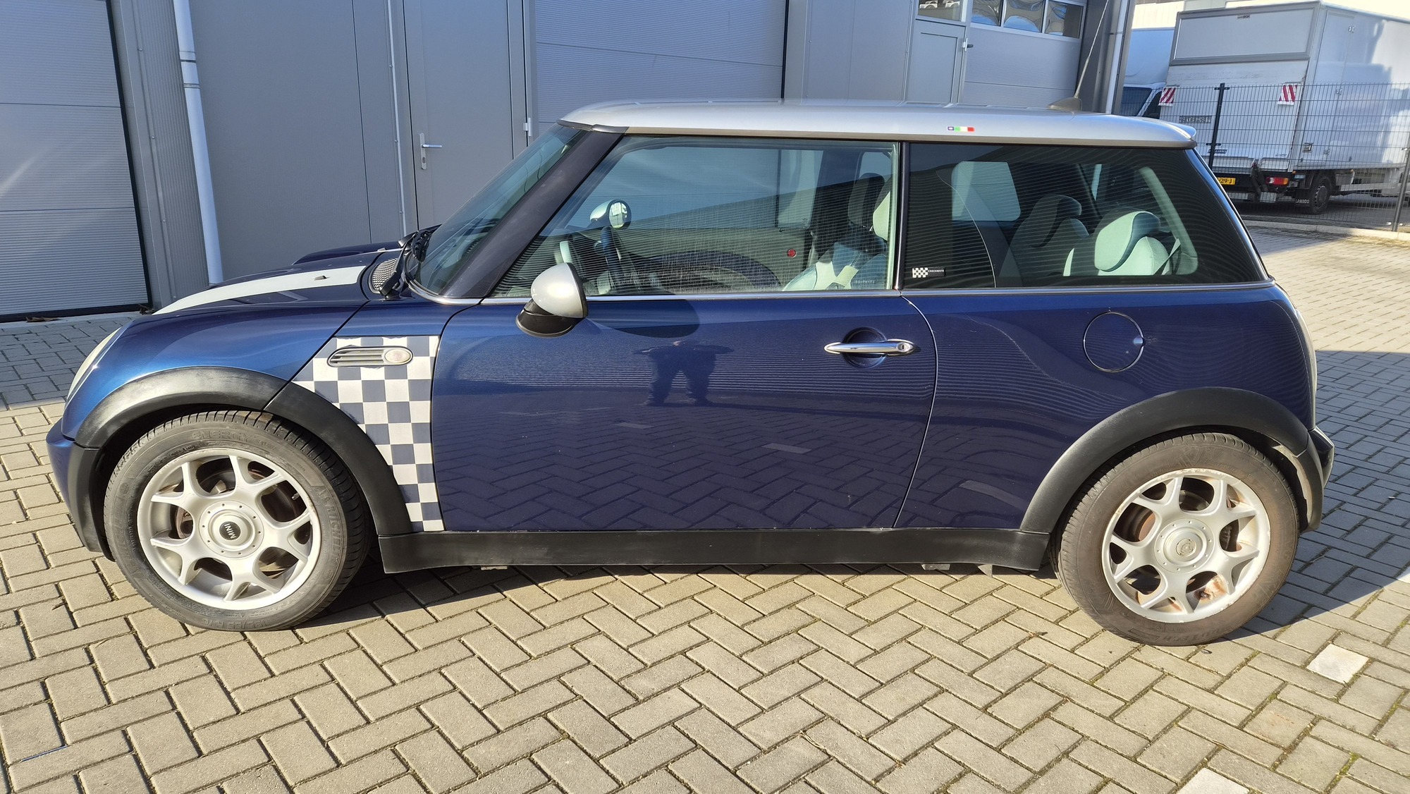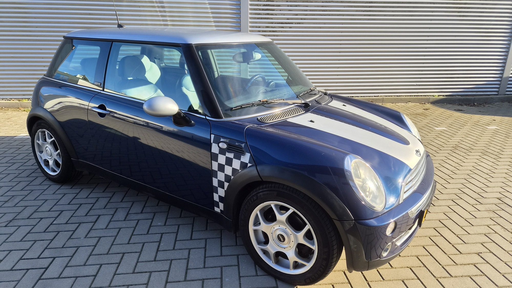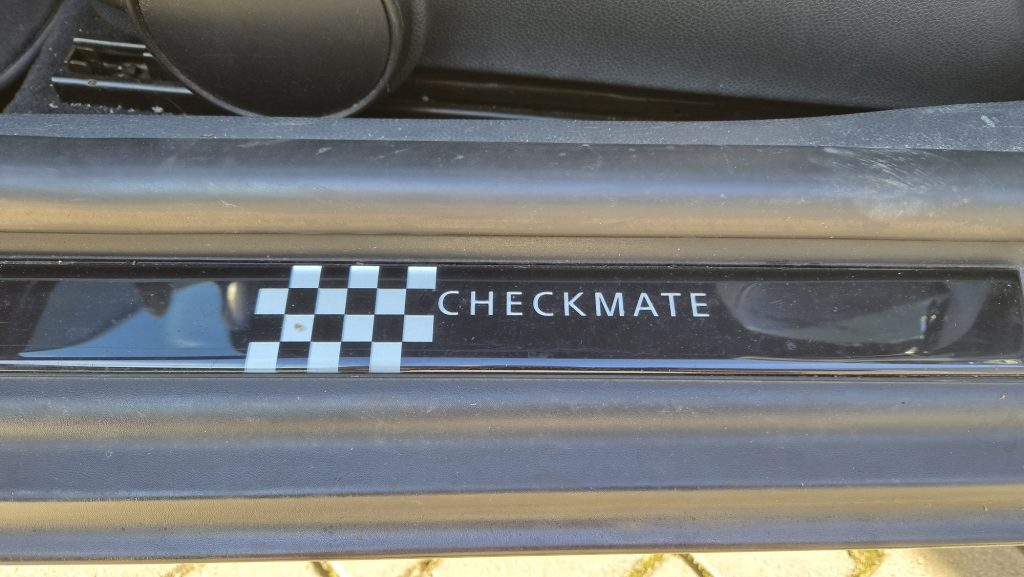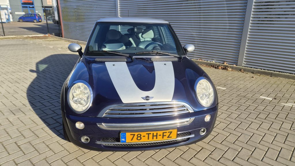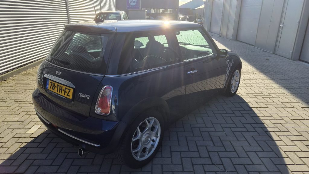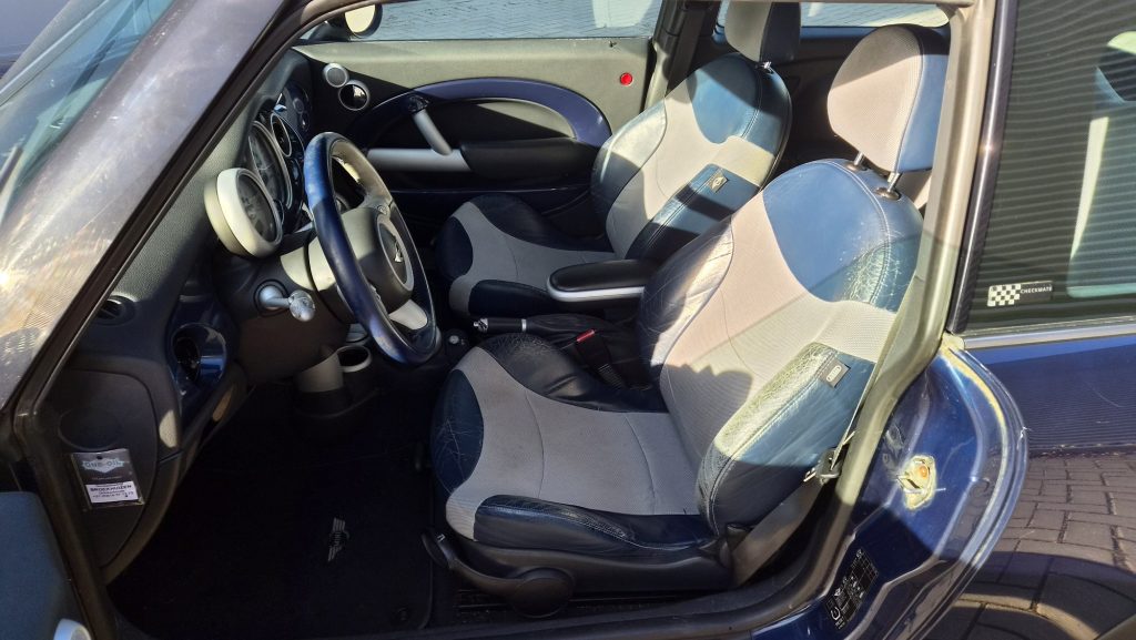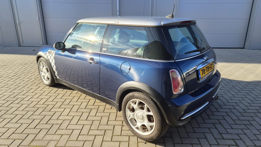 Het is een originele special edition, herkenbaar aan de schaakbord-graphics en het unieke blauw/beige lederen interieur. Ondanks de ‘ervaring’ van 300k kilometer is de auto in een opvallend goede staat. Hij rijdt, stuurt en schakelt zoals een MINI hoort te doen: als een kart.