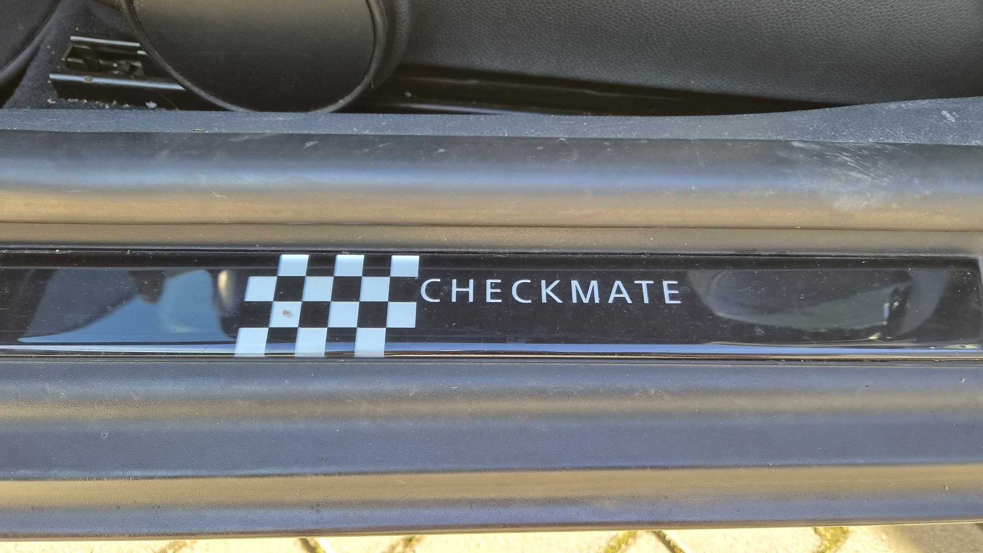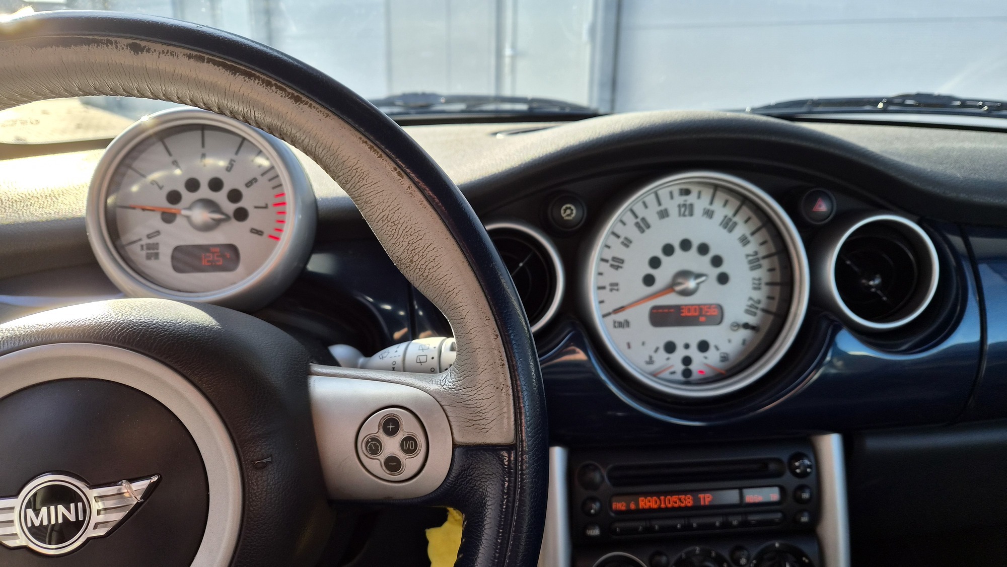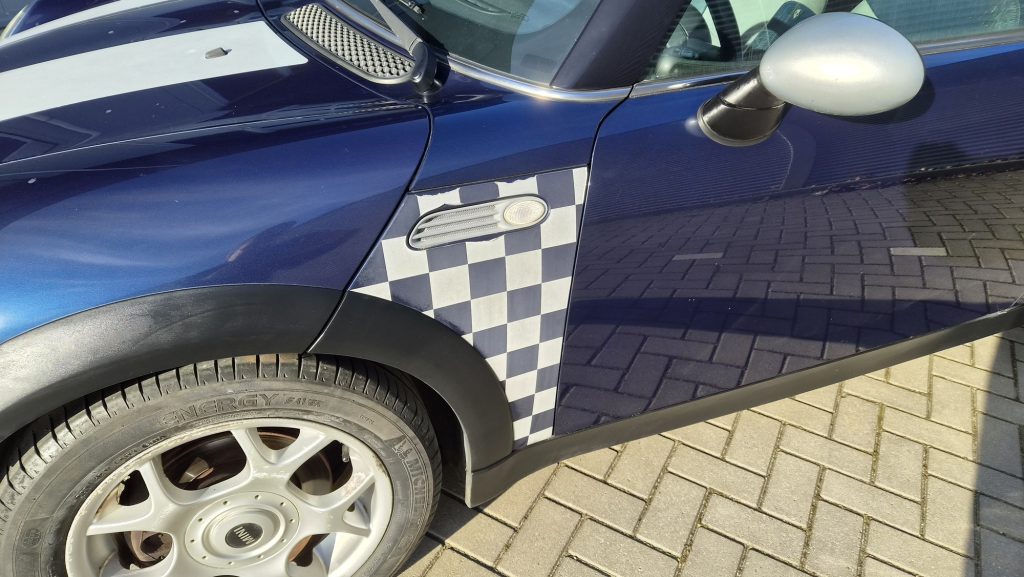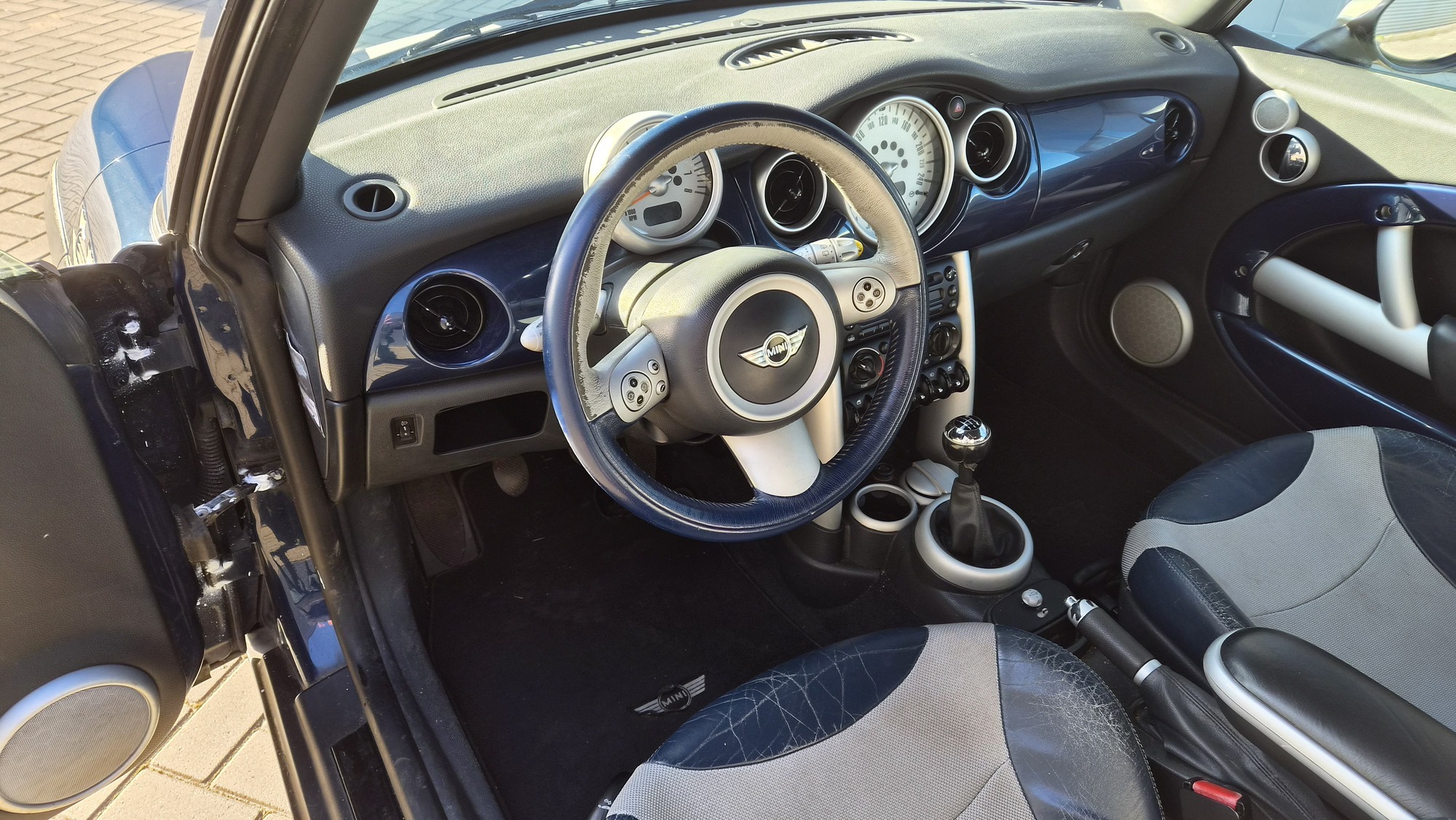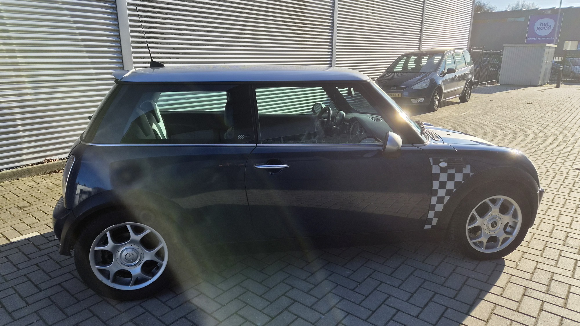 Het is een originele special edition, herkenbaar aan de schaakbord-graphics en het unieke blauw/beige lederen interieur. Ondanks de ‘ervaring’ van 300k kilometer is de auto in een opvallend goede staat. Hij rijdt, stuurt en schakelt zoals een MINI hoort te doen: als een kart.